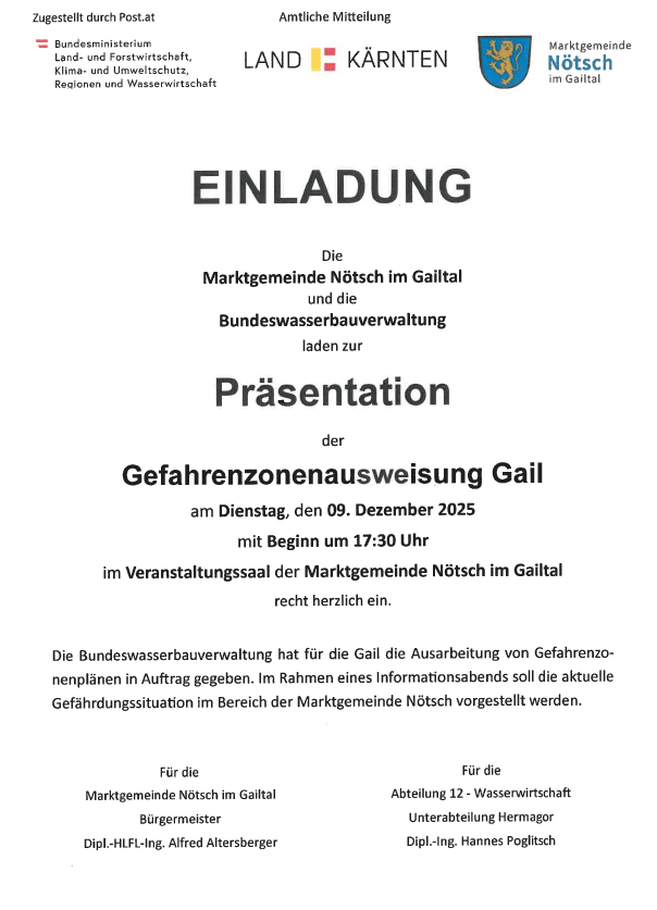 Einladung Präsentation Gefahrenzonenausweisung Gail - 09. Dezember 2025