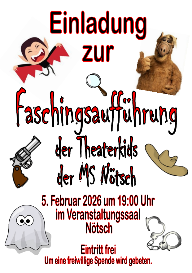 Einladung zur Faschingsaufführung der Theaterkids der MS Nötsch